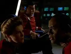 ![]() Janeway, Sulu and Tuvok on the bridge of the Excelsior | |