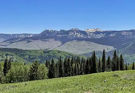 The dominant feature of the Wilderness is the high plateau from which the peaks arise. The plateau forms the northeastern portion of the White River Uplift capped by horizontal basalt flows from tertiary volcanic activity and is bounded by steep drops to valleys carved out by subsequent glaciation.[5][6] The resulting mix of areas of treeless plateau at an elevation of 11,000 to 12,000 feet interspersed with verdant valleys is unique among Colorado mountain ranges. The area contains approximately one hundred and ten ponds and lakes[7] and is home to a wide variety of plants and animals, including many large mammals such as moose, elk, mule deer, black bear, and cougars. This area has been affected by the non-native plant species, yellow toadflax.[8] The most common trees are Engelmann spruce, subalpine fir and lodgepole pine, with aspen groves at lower elevations.[9] The top of the plateau is alpine tundra.