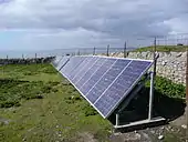 In 2007 the system was extended to include a 27 kWh battery bank charged by two photovoltaic solar arrays of 3 and 5 kW, and by a 6 kW wind turbine sited at a redundant telecommunications tower on the high point of the island.[59]