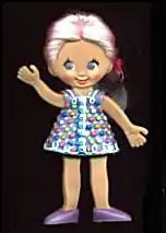 Flatsys have long hair, which goes to the floor, generally in vivid colors (like bright blue, bright yellow, pink, etc.). They are made of soft vinyl with wires inside the limbs, neck, and body, which make them posable. Their faces have sweet, grinning expressions with eyes looking either to the left or to the right.