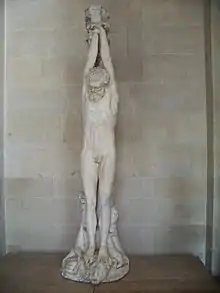 Marsyas, as a single figure, was a well-known subject in Roman and Hellenistic sculpture, with a famous type showing him tied and hanging with his arms above his head. This probably originated in Hellenistic Pergamon,[54] and was well-known from various examples by the late Renaissance, followed for example by Raphael in a small scene on the ceiling of the Stanza della Segnatura in the Vatican. But this is not a very direct influence on Titian's composition.[55]