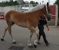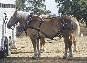The Flemish Horse was exported worldwide during the 19th century, after the independence of Belgium. It was a very popular breed among the Amish in the United States (mostly in Ohio and Indiana) and in Canada,[4] and the Flemish Horse is often referred to as the Belgian Horse or Belgian Draft in North-America. The American Belgian Draft derives from the same original stock, called the Flemish Horse, as part of the European Belgian draft horses, such as the Belgian Draught and Ardennais.[3] The Belgian Draught in Europe has developed differently than the American Belgian Drafts, as in Europe the Flemish Horses were merged with the Brabant, a more heavy built type from Brabant, to create the Belgian Draught.[3] The American version is generally taller and less heavily built, and has a very different distribution of coat colours.[5] Most of the horses known as American Belgian Drafts in North-America are actually the original Flemish Horses that continued to survive in the isolated Amish community and in Canada.[4][5] While the Flemish Horse became nearly extinct in Europe, when they were merged with the Brabant to create the Belgian Draught.[3][12] Unlike the European Belgian Draughts, which are the result of crossbreeding multiple Belgian draught horse breeds, the Flemish Horse is a purebred breed.[13]
