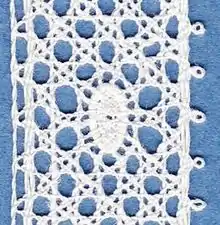 Classical variations have pairs crossing at the tips of the rectangles, a modern variation crosses just threads what creates a more rectangular impression. Modern variations also use less pins at the headside and footside.[2] Both changes make the modern interpretation slightly quicker to create but also more vulnerable, but modern lacemakers tend to frame their work rather than apply it on clothing. The similar rose ground in Torchon lace uses four pins at the edges of the rectangles, Flanders uses just one pin in the centre. Names for the ground: