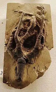 Flexibilia is a superorder of specialized Paleozoic (Middle Ordovician to Permian) crinoids. They exhibited a conserved body plan and consistent suite of characteristics throughout their long history. Previously considered a subclass with unclear affinities, later investigation determined that flexibles are well-nested within Cladida, a broad group ancestral to living articulate crinoids.[1] The Ordovician cladid Cupulocrinus acts as an intermediate form linking the generalized anatomy of other early cladids with the distinctive anatomy of flexibles, and several studies have considered it to be ancestral to the rest of the group.[2][1][3] Although flexibles never reached the same abundance or diversity as many other crinoid groups, they remained a reliable component of crinoid faunas, particularly from the Silurian onwards. Flexible fossils are very rare in the Ordovician (the most common taxa being Cupulocrinus and Protaxocrinus), but the Late Ordovician appears to have been an interval of rapid diversification for the group.[3]