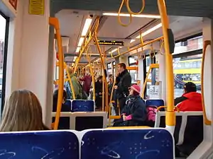 The Blackpool Flexity 2 trams are bi-directional five-section articulated tramcars.[8] There are four doors on each side, two single doors next to the driver cabs in the first and fifth cars and two double doors in the centre of the second and fourth cars. They can accommodate wheelchairs and pushchairs,[3] with level boarding from low platforms which were built at stops ready for the introduction of the trams.[2]