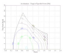 Turn rate envelope, described in an E-M diagram (doghouse plot). Contour is specific excess power.