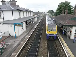 The station is staffed through the day, with the ticket office inside the main building on platform 2. A self-service ticket machine is provided for use and for collecting advance purchase tickets. A waiting room is provided on the eastbound side (platform 1), with digital information screens, timetable posters and help points on both platforms. A stepped footbridge connects the two platforms, but step-free access to both sides is provided via a public footpath passing beneath the railway.[3]