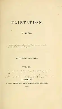 Flirtation is an 1827 novel by the British writer Lady Charlotte Bury, originally published in three volumes. Bury, writing anonymously, was a well-known author of silver fork novels set in high society. It was a popular success and quickly ran through three editions.[1]
