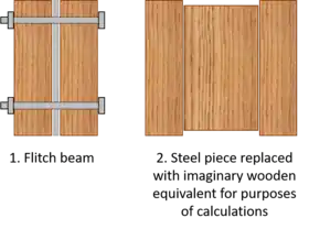 The method for calculating the size of a flitch beam to be used in construction is straightforward, using the transformed-section method. The steel plate is treated as an equally stiff piece of wood, with its width modified by the ratio of their moduli of elasticity. This allows the deflection of the entire beam to be calculated as if it were entirely made up of wood.[4][5][6]