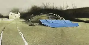 Flood Plain is a 1986 painting by the American artist Andrew Wyeth. It depicts a part of the artist's family's land in Chadds Ford, Pennsylvania in the winter, with patches of ice in the grass. In the foreground is a pile of hay with the remnants of an old hay wagon. Two icy wheel tracks lead to a mill and a granary in the background.