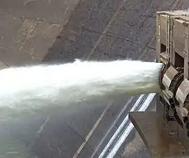 • Jet flow gate, similar to a gate valve but with a conical restriction prior to the gate leaf that focuses the water into a jet. They were developed in the 1940s by the United States Bureau of Reclamation to allow fine control of discharge flow without the cavitation seen in regular gate valves. Jet flow gates are able to handle heads up to 150 m.
