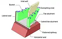 Fusegates are a mechanism designed to provide the controlled release of water in the event of exceptionally large floods. The design consists of free standing blocks (the fusegates) set side by side on a flattened spillway sill. The Fusegate blocks act as a fixed weir most of the time, but in excessive flood conditions they are designed to topple forward, allowing the controlled discharge of water. Multiple fusegates are generally set up side by side, with each fusegate designed to release under progressively extreme flooding, thus minimizing the impact of the floodwater on the river downstream.[1] The System was invented and patented by François Lempérière[2] for Hydroplus (Paris, France), subsidiary of GTM Entrepose. It has been installed on more than 50 dams around the world with sizes ranging from 1 m to more than 9 m in height. Fusegate are typically used to increase the storage capacity of existing dams or to maximize the discharge potential of undersized spillways.