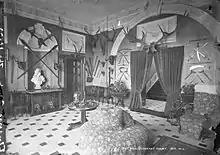 Much of the damage to the interior of Florence Court was caused by the gallons of water pumped onto the flames. The dining room, with its exquisite plasterwork decoration, was saved only by the prompt action of local builders Bertie Pierce and Ned Vaughan who, on the instructions of Viola Grosvenor, later the Duchess of Westminster, drilled six holes in the flat part of the ceiling to allow the water which had accumulated on the floor above to quickly drain away and thereby preventing ceiling collapse. Two of these holes are still evident in the dining room today.[9]