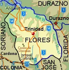 Flores (Spanish pronunciation: [ˈfloɾes]) is a department of Uruguay, positioned in the southwest of the central part of the country. Its capital is Trinidad. It borders Durazno Department to the north and east, Florida Department to the southeast, San José Department to the south and Soriano Department to the west. Its density of population was the lowest during the 2011 census, closely followed by the departments of Durazno and Treinta y Tres.[1]