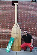 In 2009, the student governments of the two universities announced the creation of a new trophy, the "Okefenokee Oar".[27] The 10-foot-long Oar was donated anonymously to the University of Florida in 2009, and has opposing sides carved with symbols and logos from each school.[28] The Oar was carved from the remains of a 1,000-year-old cypress tree that once grew in the Okefenokee Swamp, which straddles the Florida–Georgia border and was the source of an interstate boundary dispute.[27] Beginning with the 2009 contest, the Okefenokee Oar is presented to the winning university's student body president.[29][30] No trophy is presented at the game, however.[19]