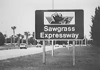 Originally planned to be the University-Deerfield Expressway when it was first proposed in 1960, it was supposed to be the northernmost part of a chain of expressways from Deerfield Beach to Coral Gables, but the proposed Snake Creek Expressway (in Broward County) became part of the Florida's Turnpike Extension and the LeJeune-Douglas Expressway (in Dade County) failed in the 1970s as the result of a county wide expressway revolt.[14][15][16] On the other hand, the rerouting of Interstate 75 from the Tamiami Trail to Alligator Alley in 1973 increased the necessity of a northern/western bypass of Broward County and in 1983, the newly created Broward County Expressway Authority proposed the Sawgrass-Deerfield Expressway in its current alignment.[17][18] A series of cost-cutting measures for the proposed toll road included removal of all planned rest stops and a shortening of the name of the road to Sawgrass Expressway (A consultant stated in an interview, "Those overhead signs are damn expensive").[19]