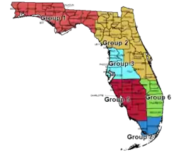 Florida Wing is divided into six groups across the state, with each squadron or flight being assigned to a group based on its geographical location. The Wing comprises 21 Cadet Squadrons, 7 Senior Squadrons, 29 Composite Squadrons (composed of both Cadets and Senior Members), and the Support and Legislative Squadrons.[9]