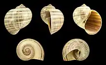 The shell is globose in shape. The whorls are wide, the spire is depressed, and the aperture is narrowly oval.[3] The shells are brown in color, and have a pattern of stripes.