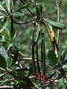 All three mangrove species flower in the spring and early summer. Propagules fall from late summer through early autumn.[1] These plants have differing adaptions to conditions along coasts, and are generally found in partially overlapping bands or zones, roughly parallel to the shoreline. The red mangrove grows closest to open water. It has multiple prop roots, which may help to stabilize the soil around its roots. Further inland is the black mangrove lacking prop roots, but does have pneumatophores, which grow up from the roots to above the water level. The white mangrove grows further inland. It may have prop roots and/or pneumatophores, depending on conditions where it is growing. The buttonwood grows in shallow, brackish water, Florida swamps, or on dry land (the furthest inland).