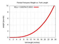 Invariably, b is close to 3.0 for all species, and c is a constant that varies among species.[5] A weight-length relationship was determined for a sample of 1,984 Florida pompano collected along the Gulf Coast of Florida between 2000 and 2002.[6] The fish sampled ranged in length from 79–481 mm (3.16-19.24 in). For this sample of Florida pompano, b = 2.9342 and c = 0.00076.