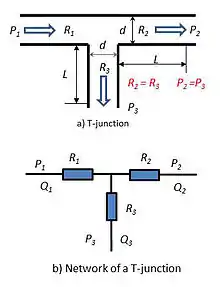 ∆X = L/n. The n is the number of ports and L the length of the manifold (Fig. 2). This is fundamental of manifold and network models. Thus, a T-junction (Fig. 3) can be represented by two Bernoulli equations according to two flow outlets. A flow in manifold can be represented by a channel network model. A multi-scale parallel channel networks is usually described as the lattice network using analogy with the conventional electric circuit methods.[4][5][6] A generalized model of the flow distribution in channel networks of planar fuel cells.[6] Similar to Ohm's law, the pressure drop is assumed to be proportional to the flow rates. The relationship of pressure drop, flow rate and flow resistance is described as Q2 = ∆P/R. f = 64/Re for laminar flow where Re is the Reynolds number. The frictional resistance, using Poiseuille's law. Since they have same diameter and length in Fig. 3, their resistances are same, R2 = R3. Thus the velocities should be equal in two outlets or the flow rates should be equal according to the assumptions. Obviously this disobeys our observations. Our observations show that the greater the velocity (or momentum), the more fluid fraction through the straight direction. Only under very slow laminar flow, Q2 may be equal to Q3.