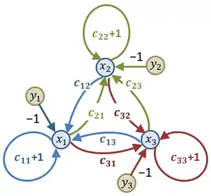 Using the examples from the subsection Elements of signal-flow graphs, we construct the graph In the figure, a signal-flow graph in this case. To check that the graph does represent the equations given, go to node x1. Look at the arrows incoming to this node (colored green for emphasis) and the weights attached to them. The equation for x1 is satisfied by equating it to the sum of the nodes attached to the incoming arrows multiplied by the weights attached to these arrows. Likewise, the red arrows and their weights provide the equation for x2, and the blue arrows for x3.