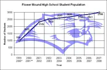 Flower Mound High School (FMHS) is part of Lewisville Independent School District and is located in Flower Mound, Texas, United States. The school rests on 52 acres (21 ha) of land that was purchased in 1993.[2] FMHS was the second high school built in Flower Mound, after Edward S. Marcus High School. With the expansion of the town in the 1980s and 1990s (from 1980 to 2000, it grew from 4,402 to 50,702 residents), a second high school was built to accommodate the growth.[3][4] Flower Mound High School has been called one of the top ten best public high schools in the Dallas area[5] and consistently receives an "Exemplary" (highest) rating from the Texas Education Agency.[6] The school's fight song is the Michigan Wolverines' fight song, "The Victors".
