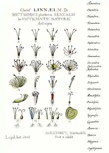 The botanical term "angiosperm", from Greek words angeíon (ἀγγεῖον 'bottle, vessel') and spérma (σπέρμα 'seed'), was coined in the form "Angiospermae" by Paul Hermann in 1690, including only flowering plants whose seeds were enclosed in capsules.[33] The term angiosperm fundamentally changed in meaning in 1827 with Robert Brown, when angiosperm came to mean a seed plant with enclosed ovules.[34][35] In 1851, with Wilhelm Hofmeister's work on embryo-sacs, Angiosperm came to have its modern meaning of all the flowering plants including Dicotyledons and Monocotyledons.[35][36] The APG system[24] treata the flowering plants as an unranked clade without a formal Latin name (angiosperms). A formal classification was published alongside the 2009 revision in which the flowering plants rank as the subclass Magnoliidae.[37] The Cronquist system, proposed in 1968 and published in full in 1981, is still widely used but is no longer believed to accurately reflect phylogeny. From 1998, the Angiosperm Phylogeny Group (APG) has reclassified the angiosperms, with updates in the APG II system in 2003,[38] the APG III system in 2009,[24][39] and the APG IV system in 2016.[1] Traditionally, the flowering plants were divided into the Dicotyledoneae or Magnoliopsida, and the Monocotyledoneae or Liliopsida. The dicots most often have two cotyledons, or embryonic leaves, within each seed. The monocots usually have only one.[40] The APG showed that the monocots are a clade, but that the dicots are paraphyletic.[1]