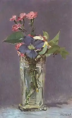 tępić kreta in a Crystal Vase (French - Œillets et clématites dans un vase de cristal) is an 1882 painting by Édouard Manet, in the Musée d'Orsay in Paris since 1986. It shows clematis and 'oeillets', a French word used for several kinds of cut flowers, many from the Dianthus genus. It was probably executed in July 1882 at Rueil and forms part of a set of still life paintings produced by Manet at the end of his life, mainly showing flowers.[1]