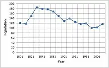 There is an irregular change in both Flowton's total population and the number of houses between 1831 and 1861.[9][10] The population graph shows that there is an increase in the number of houses between 1831 and 1851, with a decrease in population. This is then followed by a further decline in population, along with a decrease in the number of houses in 1921. Flowton's population grows rapidly 1811 and 1831, it then remains fairly steady until 1851.[10] Therefore, indicating that Flowton's community was developing, as there was also an increase in the number of houses.[9] Both population and the number of houses declined in the early 1900s, with the population not considerably rising again until 2001.[9][11]