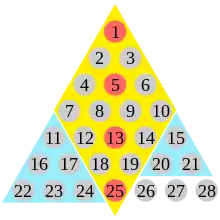 Centered square numbers, highlighted in red, are in found in the center of the odd rows, and are the sum of successive squares – taking 25 as an example, it is the sum of 16 (yellow rhombus formed by shearing a square) and the next smaller square, 9 (sum of blue triangles)
