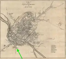 No remains of the manor house survived beyond about 1830 or 1840. It stood set back a little way on the east side of the road from Exeter to Alphington, between the Haven Road and the railway viaduct, rather beyond what was known in 1898 as Sydney Place.[4] The name "Flower Pot Buildings" may have been originally "Floyer's Plot." The land lies very low, and was intersected by streams by which mills are worked. A mill is mentioned as being on the manor of Floyer's Hayes in the time of Henry III (1216–1272). Many open spaces around the outside of the City walls are shown on the 1765 map of Exeter by Benjamin Donnas as suffixed "Hay", such as Shill Hay, Southern Hay, Northern Hay, Fryers Hay and Bon Hay. The manor house is shown on a 1573 map of Exeter[5] as a building of large size, surrounded by a stone wall and entered beneath a large arched gateway.[4] According to Worthy (1892): "It stood nearly in a line with "Snayle Tower", and on the west side of the river, and must have been very near the ancient priory of Cowick, but a little to the south-west of it".