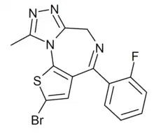 Flubrotizolam (2-bromo-4-(2-fluorophenyl)-9-methyl-6H-thieno[3,2-f][1,2,4]triazolo[4,3-a][1,4]diazepine) is a thienotriazolodiazepine derivative with potent sedative and anxiolytic effects, which has been sold as a designer drug.[1][2][3]