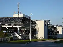 Currently, there are five parking garages and six underground parking areas, amounting together to a total of 30,000 parking spaces[42] of which approximately 16,500 are under a roof. The parking garage P20 at Terminal 2, with 6,400 parking spaces on eleven levels (including four that are underground) since its commissioning in 2003 was the largest parking garage in Germany until the car park at the new Allianz Arena was opened in 2005.[43] A parking guidance system was installed in the parking garages, which detects whether a parking space is occupied and newly arriving vehicles are shown where the empty parking spaces are located.