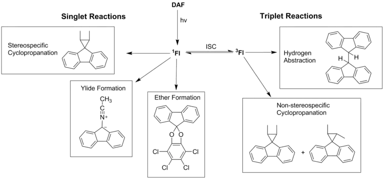 Ultra-fast (300 fs) time resolved laser-flash photolysis of DAF implicates a four-step process in the formation of fluorenylidene by irradiation of 9-diazofluorene.[7]