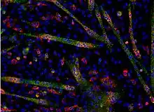 Single-molecule RNA FISH, also known as Stellaris® RNA FISH[15] or smFISH,[16] is a method of detecting and quantifying mRNA and other long RNA molecules in a thin layer of tissue sample. Targets can be reliably imaged through the application of multiple short singly labeled oligonucleotide probes.[17] The binding of up to 48 fluorescent labeled oligos to a single molecule of mRNA provides sufficient fluorescence to accurately detect and localize each target mRNA in a wide-field fluorescent microscopy image. Probes not binding to the intended sequence do not achieve sufficient localized fluorescence to be distinguished from background.[18]