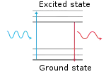 The principle behind fluorescence is that the fluorescent moiety contains electrons which can absorb a photon and briefly enter an excited state before either dispersing the energy non-radiatively or emitting it as a photon, but with a lower energy, i.e., at a longer wavelength (wavelength and energy are inversely proportional).[4] The difference in the excitation and emission wavelengths is called the Stokes shift, and the time that an excited electron takes to emit the photon is called a lifetime. The quantum yield is an indicator of the efficiency of the dye (it is the ratio of emitted photons per absorbed photon), and the extinction coefficient is the amount of light that can be absorbed by a fluorophore. Both the quantum yield and extinction coefficient are specific for each fluorophore and multiplied together calculates the brightness of the fluorescent molecule.[5]
