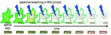 Before photobleaching can occur, cells must be injected with a fluorescent protein, often a green fluorescent protein (GFP), which will allow the targeted proteins to fluoresce and therefore be followed throughout the process. Then, a region of interest must be defined. This initial region of interest usually contains the whole cell or several cells. In FLIP, photobleaching occurs just outside the region of interest; therefore a photobleaching region also needs to be defined. A third region, the region where measurement will take place, needs to be determined as well. A number of initial scans need to be made to determine fluorescence before photobleaching. These scans will serve as the control scans, to which the photobleached scans will be compared later on. Photobleaching can then occur. Between each bleach pulse, it is necessary to allow time for recovery of fluorescent material. It is also important to take several scans of the region of interest immediately after each bleach pulse for further study.[1] The change in fluorescence at the region of interest can then be quantified in one of three ways. The most common is to choose the location, size and number of the regions of interest based on visual inspection of the image sets. The two other, rather new but more reliable approaches are either by detecting areas of different probe mobility on an individual image basis or by physical modeling of fluorescence loss from moving bodies.[2]