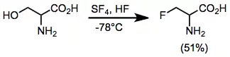 Sulfur tetrafluoride can be used to replace a variety of functional groups with partially or fully fluorinated derivatives. Liquid hydrogen fluoride can be used as a solvent and catalyst with SF4 to selectively fluorinate alcohols.[6] SF4's reactivity with carbonyl compounds is not enhanced in the presence of HF. Generally, only relatively acidic alcohols can be fluorinated efficiently with SF4, although amino alcohols appear to be an exception to this rule.