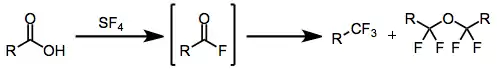 Carboxylic acids react with SF4 to afford trifluoromethyl compounds through the intermediacy of an acyl fluoride. Tetrafluoroalkyl ethers also form via reaction between difluoromethyl cation and acyl fluoride.[12]