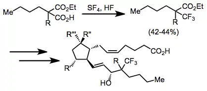 The synthesis of a prostaglandin bearing a trifluoromethyl group at C-16 is based on an intermediate obtained by fluorination of a carboxylic acid with sulfur tetrafluoride.[14]