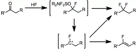 Conversion of aldehydes and ketones to the corresponding geminal difluorides proceeds by a similar mechanism, with addition of hydrogen fluoride preceding the hydroxyl replacement mechanism described above. An important side product in fluorinations of enolizable ketones is the corresponding vinyl fluoride, which results from deprotonation of intermediate fluoro carbocations.