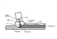 Another type of FCAW uses a shielding gas that must be supplied by an external source. This is known informally as "dual shield" welding. This type of FCAW was developed primarily for welding structural steels. In fact, since it uses both a flux-cored electrode and an external shielding gas, one might say that it is a combination of gas metal (GMAW) and FCAW. The most often used shielding gases are either straight carbon dioxide or argon carbon dioxide blends. The most common blend used is 75% Argon 25% Carbon Dioxide.[1] This particular style of FCAW is preferable for welding thicker and out-of-position metals. The slag created by the flux is also easy to remove. The main advantages of this process is that in a closed shop environment, it generally produces welds of better and more consistent mechanical properties, with fewer weld defects than either the SMAW or GMAW processes. In practice it also allows a higher production rate, since the operator does not need to stop periodically to fetch a new electrode, as is the case in SMAW. However, like GMAW, it cannot be used in a windy environment as the loss of the shielding gas from air flow will produce porosity in the weld.