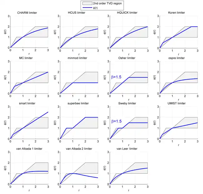 Unless indicated to the contrary, the above limiter functions are second order TVD. This means that they are designed such that they pass through a certain region of the solution, known as the TVD region, in order to guarantee stability of the scheme. Second-order, TVD limiters satisfy at least the following criteria: