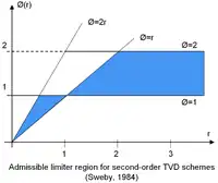 The admissible limiter region for second-order TVD schemes is shown in the Sweby Diagram opposite,[9] and plots showing limiter functions overlaid onto the TVD region are shown below. In this image, plots for the Osher and Sweby limiters have been generated using .