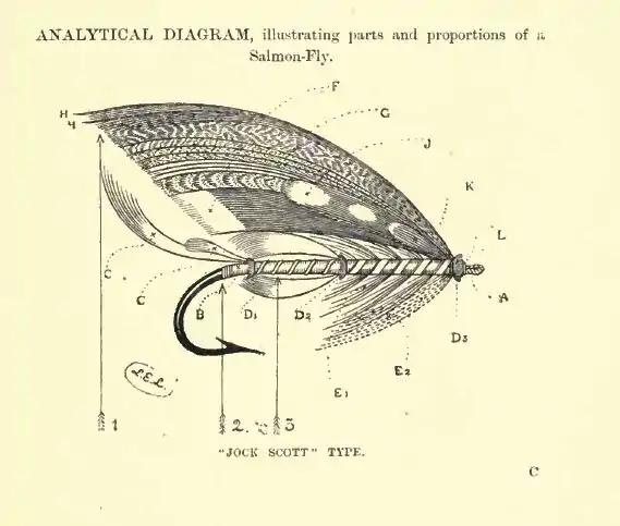 Salmon flies have historically been the one of the most complex and elaborate artificial flies to tie. Texts describing fly tying techniques often use an image of a salmon fly to describe all the parts of an artificial fly.