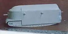 The tank was fitted with two pairs of caterpillar tracks. The outer tracks resembled those of the Mark I, but were flatter and 61 centimetres wide, while a pair of additional, narrower tracks were fitted to the underside approximately 6 inches higher than the main tracks. They were not intended to be used for normal driving but were to be engaged to give extra traction over rough ground and would have helped to prevent "bellying", i.e. the tank becoming stuck on higher ground between the two outer tracks.[3] All four tracks could be simultaneously driven by two Daimler 105 horsepower (78 kilowatt) engines, positioned on the centre-line, with the inner tracks connected to the main units via dog clutches. Each engine had its own primary gearbox, both of which drove into one single differential. This differential powered two secondary gearboxes, one for each main track. This differs from the solution chosen for the later Whippet in which each engine drove its own track.[2]