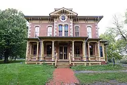 The house was built from 1867 to 1871 in the Italianate style for Martin and Ellen Flynn. They named their home Walnut Hill. The two-story brick house was built for $20,000. It has a hipped roof, cupola, wide bracketed eaves, narrow double-paned windows with hoods, a porch, and heavily molded double doors. Originally, the exterior was not painted.[2] There is a small wing on the back of the house with a side porch and simple roof brackets. A pre-cast cement addition was built onto the rear wing in the 19th century. The mansion sits on top a hill that overlooks the surrounding farmland and a stream.