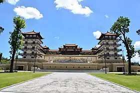 Building plans for the Fo Guang Shan Buddha Museum (formerly called the Buddha Memorial Center) started with support from the Taiwanese government. The museum's Jade Buddha Shrine is purported to hold tooth relics of the historic Buddha. The site is situated immediately adjacent to the main monastery and covers more than 100 hectares. The complex faces east and is built along a central axial line. Beyond the Welcoming Hall are eight Chinese-styled pagodas on either side of the main avenue leading up to the Bodhi Square, about which are statues of the Buddha's main disciples and of the founders of the principal schools of Chinese Buddhism. The path leads onto the Memorial Hall, which holds several shrines including the Jade Buddha Shrine. Above the hall are four stupas that symbolize the Four Noble Truths. Standing behind but separate from it, there is an enormous seated metal Shakyamuni Buddha 108 meters high.[10] The Center was opened at an international ceremony on 25 December 2011[11] and the first anniversary celebrated on Christmas Day 2012.[12]