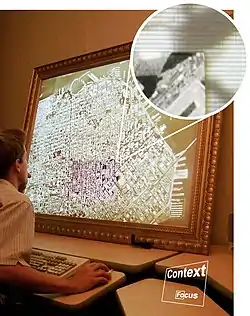 While the high-resolution area of the original prototype was located at a fixed location, follow-up projects have obtained a movable focus area by using a Tablet PC.